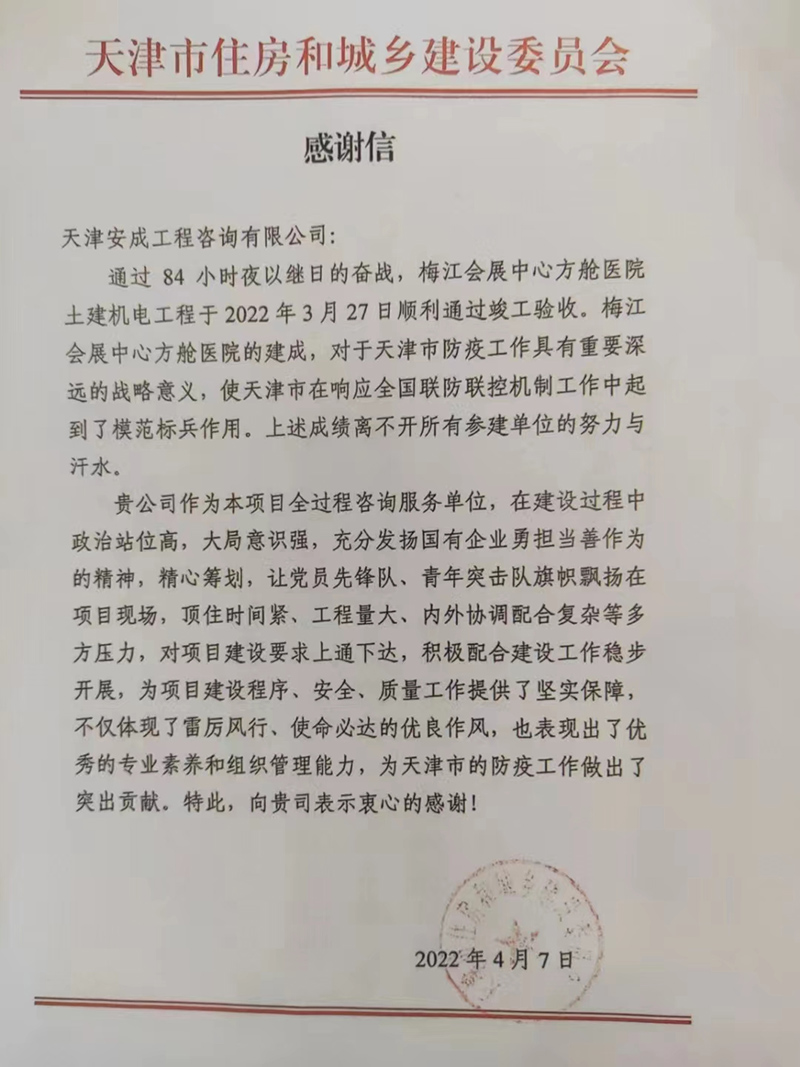 經(jīng)過84小時(shí)夜以繼日的奮戰(zhàn),梅江會(huì)展中心土建機(jī)電工程于2022年3月27日順利通過竣工驗(yàn)收。4月7日,天津市住房和城鄉(xiāng)建設(shè)委員會(huì)向安成公司發(fā)來感謝信,對(duì)安成公司在項(xiàng)目建設(shè)過程中體現(xiàn)出的雷厲風(fēng)行、使命必達(dá)的優(yōu)良作風(fēng)以及優(yōu)秀的專業(yè)素養(yǎng)和組織管理能力給予了高度認(rèn)可。