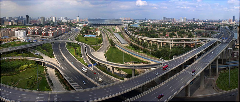 天津西站交通樞紐西縱聯(lián)絡線立交橋 坐落于紅橋區(qū),總面積約25.6萬平米,為大型過鐵路互通式立交,橋梁面積約6.3萬平米,為我公司承攬的最長的高標準橋梁工程。