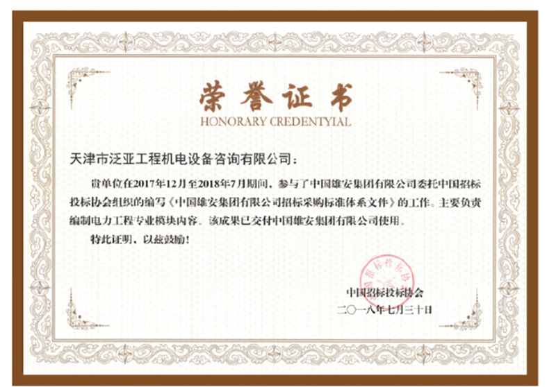 泛亞公司參與編制了雄安集團《中國雄安集團招標采購標準體系文件》,獨立完成了電力工程專業(yè)模塊的編制工作,為雄安新區(qū)的發(fā)展貢獻泛亞智慧,在雄安新區(qū)展現(xiàn)天津名片,得到各方好評。